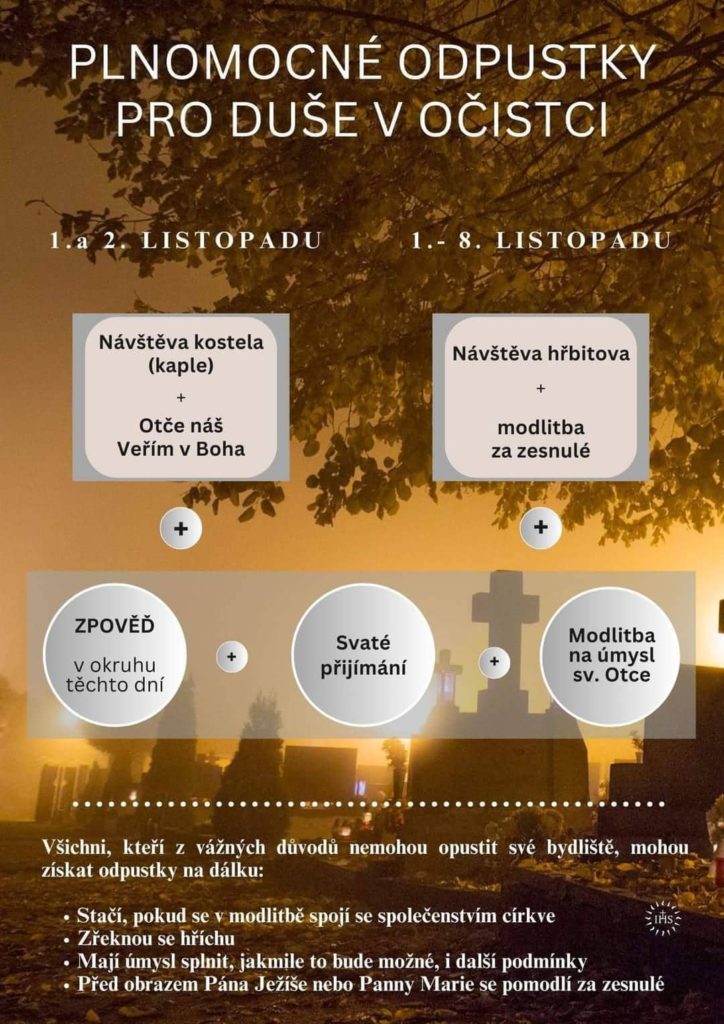 Apoštolská penitenciárie vydala dekret, kterým dává věřícím dovolení získat diecézí plnomocné odpustky pro duše v očistci již od 25. října, pokud takto nemohou učinit v době od 1. do 8. 11. Plnomocné odpustky jsou přivlastnitelné pouze duším v očistci. Kromě tří obvyklých podmínek: sv. zpověď, sv. přijímaní, modlitba na úmysl Svatého Otce, je podmínkou pomodlit se při návštěvě hřbitova za zemřelé.