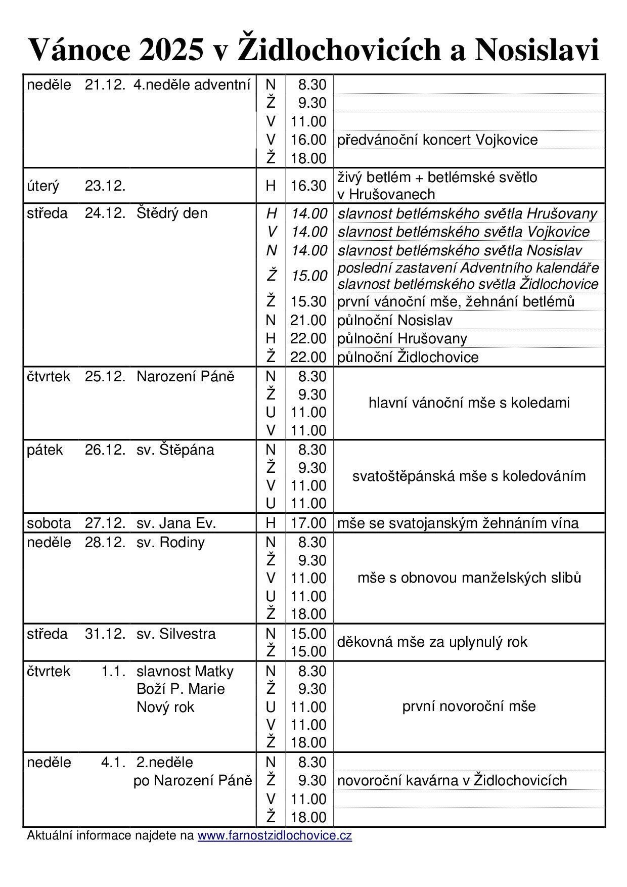 Moji milí farníci, Vánoce nejsou jen o krásných tradicích, ale o setkání s Bohem, který nás nesmírně miluje. Přeji vám, abyste během tohoto vánočního času pocítili skutečnou Boží blízkost. Kéž vás Kristův pokoj provází nejen během svátků, ale i po celý nadcházející rok. Děkuji vám za pomoc ve farnosti a že tvoříte naši farní rodinu. Ať Pán Ježíš – Kníže pokoje žehná našim rodinám, našemu městu a obcím!