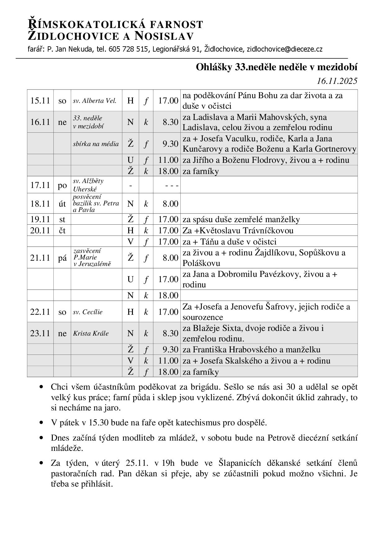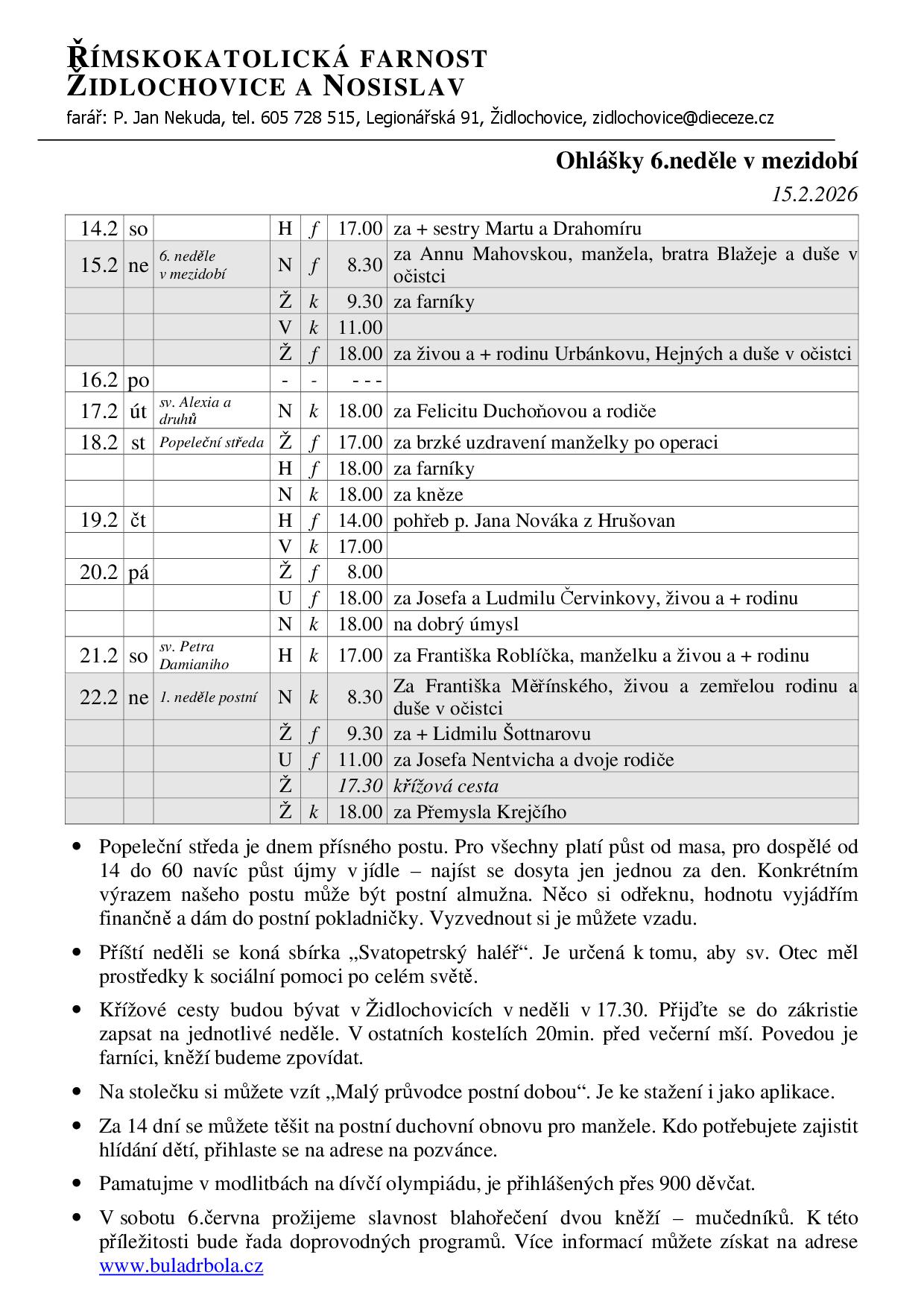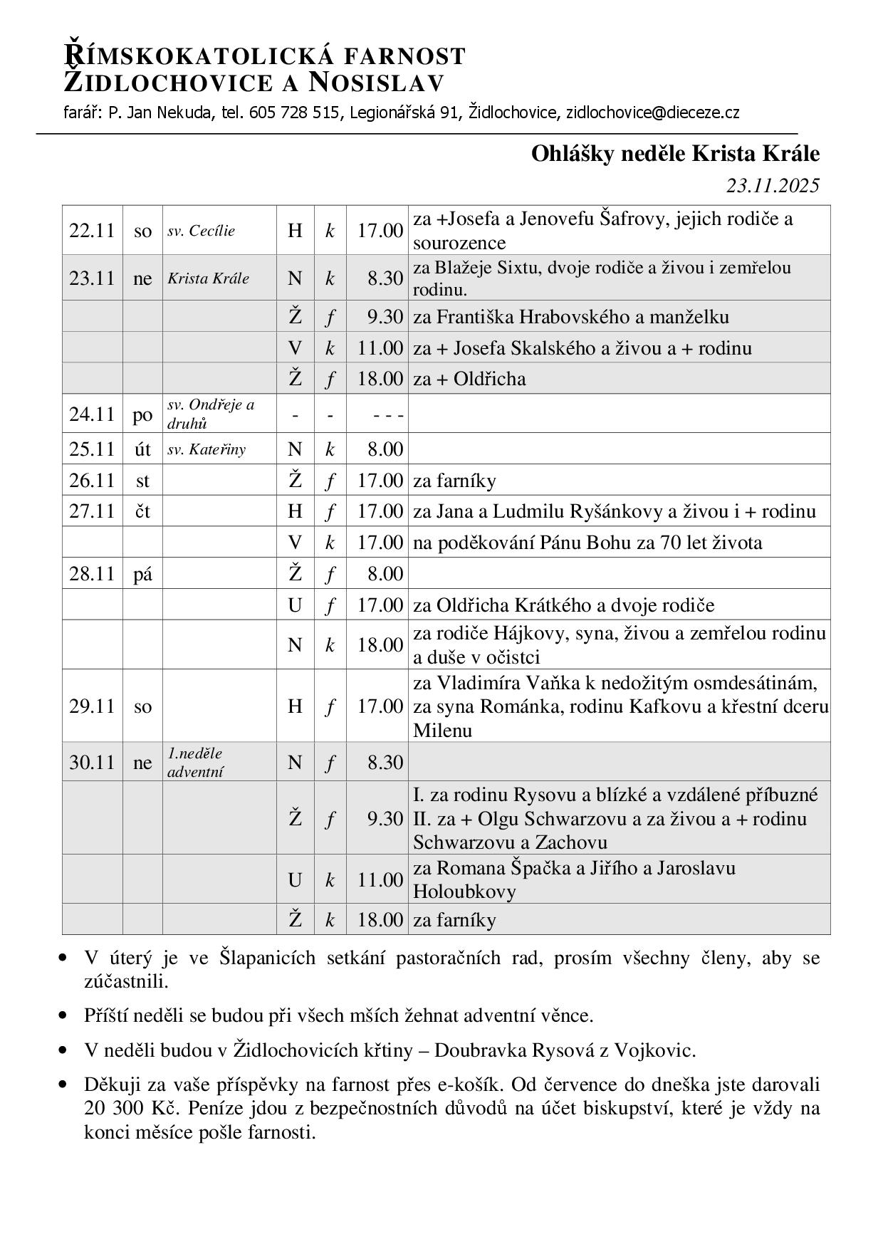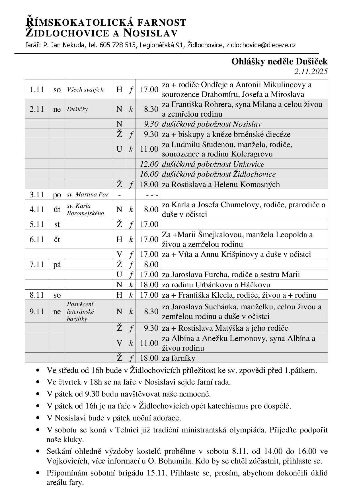 18.00 Židlochovice za všechny živé a zemřelé farníky a dobrodince našeho kostela,...