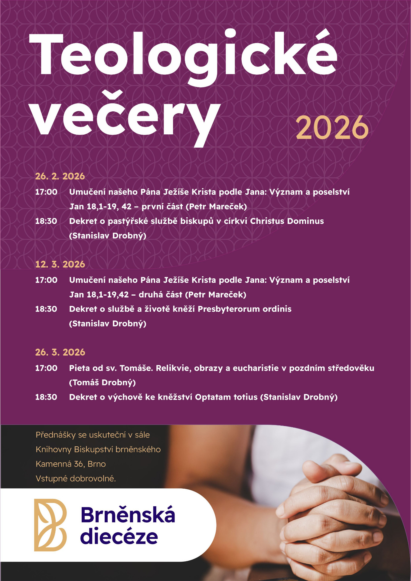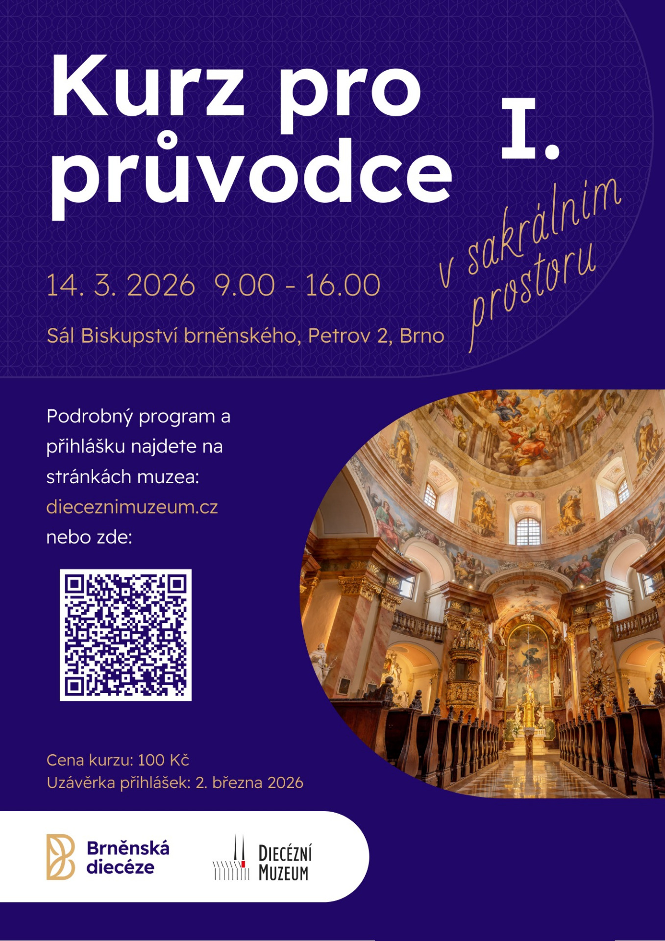 Diecézní muzeum na Petrově opět připravuje celodenní seminář pro zájemce o průvodcovskou službu a kustody v sakrálním prostoru. Konat se bude v sobotu 29. března v sále budovy Petrov 2 od 9.00 do 16.00. Účastníci si vyslechnou přednášky z různých oborů, odborníci se budou věnovat specifikům liturgického prostředí, základním pojmům z dějin umění, službě průvodce a prostor bude také na bezpečnost v církevních památkách a interaktivní provázení. V případě dotazů nás prosím kontaktujte na e-mailu muzeum@biskupstvi.cz. Po absolvování kurzu obdrží účastníci osvědčení. Přihlašování přes odkaz zde, uzávěrka přihlášek 23. března.