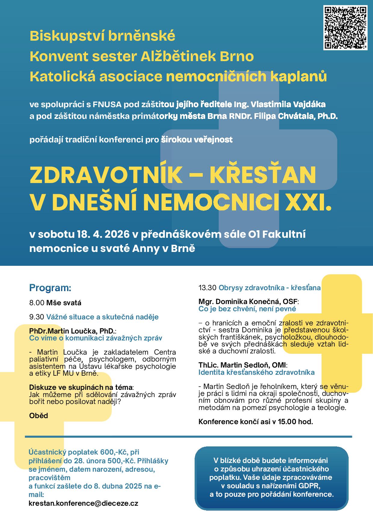 V sobotu 3. května vás zveme na tradiční konferenci Zdravotník - křesťan v dnešní nemocnici, která se uskuteční v přednáškovém sále Fakultní nemocnice u sv. Anny v Brně. Na programu je mše svatá, přednáška P. Marka Orko Váchy Šťastný zdravotník a poté diskuze k tématu, přednáška P. MUDr. Mgr. Martina Moravce O.Cr Jak neztratit hlavu ani srdce a přednáška psycholožky Mgr. Zuzany Chomové s názvem Projdi se vnitřní krajinou. Přihlášky (jméno, datum narození, adresa, pracoviště a pracovní pozice) posílejte na e-mail: krestan.konference@dieceze.cz. Účastnický poplatek je 600 Kč, při přihlášení do 30. března 500 Kč.